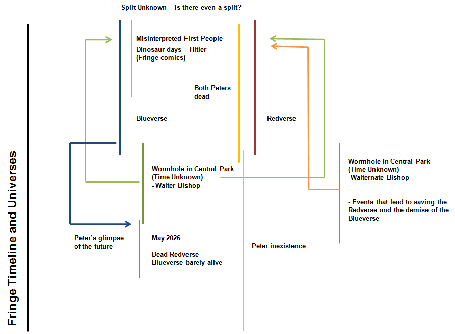 The purple line represents the supposedly when the First People rule the world prior to the existence of the dinosaurs. I put misinterpretation in there because we all know now that the First People is Walter (or should I say are the future people?!). I’ll deal with this in another blog post. We also know from the Fringe comics, that Hitler was sent to the dinosaur days (and yes, that’s one of the answers in the Fringe bootcamp competition). The purple line is a ‘universe of its own’. We are not sure yet if the comics actually in the same reality is the television. The “true” First People could still be true, so I’m also dumping that to this universe. But again, for non-confusion, this is under the blueverse universe (hence the overlap), and was misinterpreted by the fifth Sam Weiss.